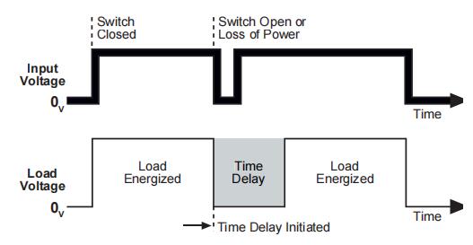 With application of power, the load is energized. When the thermostat opens or there is a loss of power, the load is de-energized and the delay period begins.
